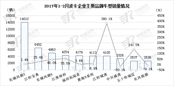 长城皮卡2月两大改款车型上市:2017年1-2月长城汽车继续领跑皮卡市场,共计销售皮卡1.9万辆,同比增长11.1%,市场份额32.8%的长城皮卡11%的增速对皮卡市场的恢复起了关键性作用,这主要归功于长城为满足用户需求推出的两款改款车型新风骏5和新风骏6。2017年2月3日,长城汽车旗下新风骏5欧洲版和新风骏6焕新上市。