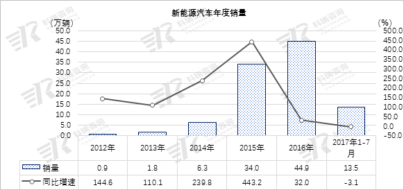 近几年新能源市场迎来了爆发式增长,2015年增幅接近4.5倍,2016年新能源汽车市场销量达到了峰值,累计销售44.9万辆,伴随着新能源汽车的发展,有些不法分子却从中违规牟利,“骗补”成为汽车领域公开的秘密。因此,2016年新能源汽车产业迎来了政策调整期,国家对新能源汽车产业发展进行了规范、治理,促使新能源汽车发展回归到理性发展,良性发展中来。从市场的销售来看,政策效果显现,市场回归至常态。