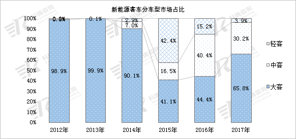 近几年新能源客车市场结构出现了调整,与往年大客几乎占有总体市场表现不同,轻客、中客市场占比也出现了提高,新能源作为客车新兴的燃料市场,现在已经渗透到了客车各细分车型市场中。