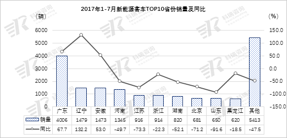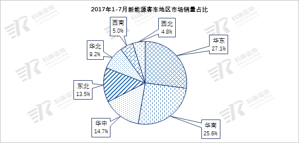 分区域市场来看,新能源客车主要集中在我国的东部沿海地区,西部地区占比相对较小。今年东北和华南地区市场表现突出,销量增长均超过40%,其他地区均下滑,此2个地区成为今年前7月新能源客车市场的增长点。