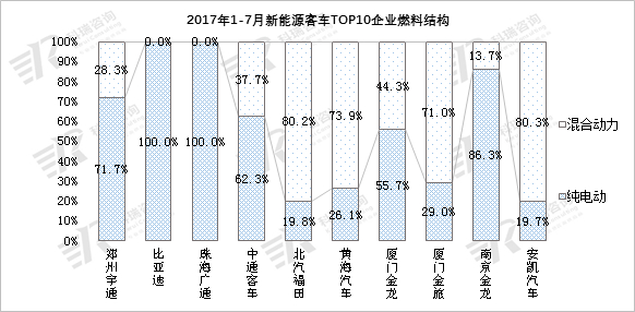 分企业燃料类型来看,TOP10企业产品的特点也不尽相同,比亚迪、广通客车只销售纯电动客车,宇通、中通、厦门金龙、南京金龙产品以纯电客车为主,其他企业以混动车型为主。