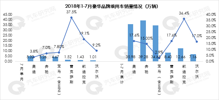 而与此恰恰相反的是,豪华品牌市场却一片火爆!7月奥迪销售5.32万辆,同比增长3.8%;奔驰销售5.26万辆,增长7%;宝马(含MINI)销售4.67万辆,增长7.8%,BBA保持持续稳定增长。第二阵营中,雷克萨斯销售1.52万辆,虽然与第一阵营的BBA相比尚有不小差距,但其比上年增长37.5%的增速不可小觑;凯迪拉克销售1.43万辆,增速也达到19.1%;沃尔沃销售1.01万辆,保持增长9.2%。