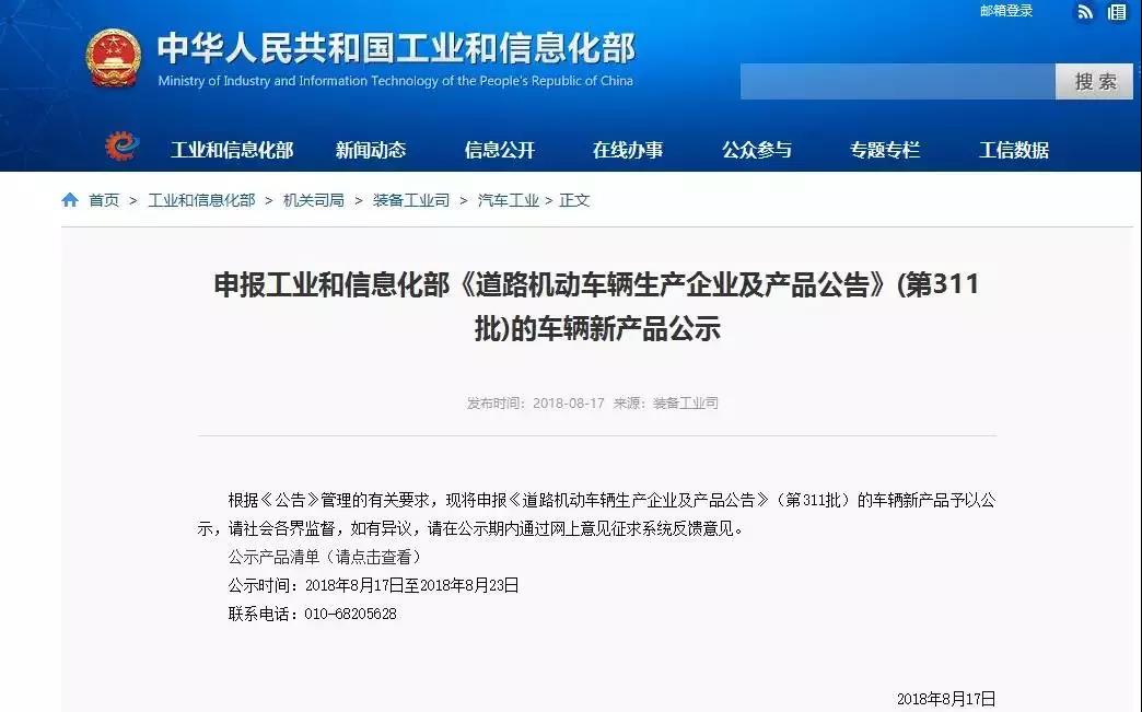 8月17日,工业和信息化部在官方网站公示了申报第311批《道路机动车辆生产企业及产品公告》的车辆新产品。
