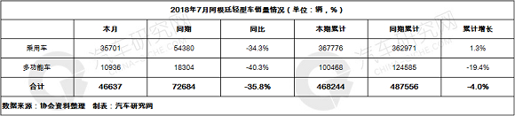 2018年1-7月阿根廷累计销量46.8万辆,同比下降4.0%。其中,乘用车1-7月累计销量36.8万辆,同比增长1.3%;多功能车1-7月累计销量10.0万辆,同比下降19.4%。