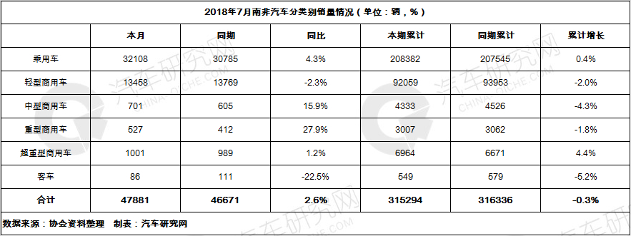 2018年1-7月南非汽车累计销量31.5万辆,同比下降0.3%。