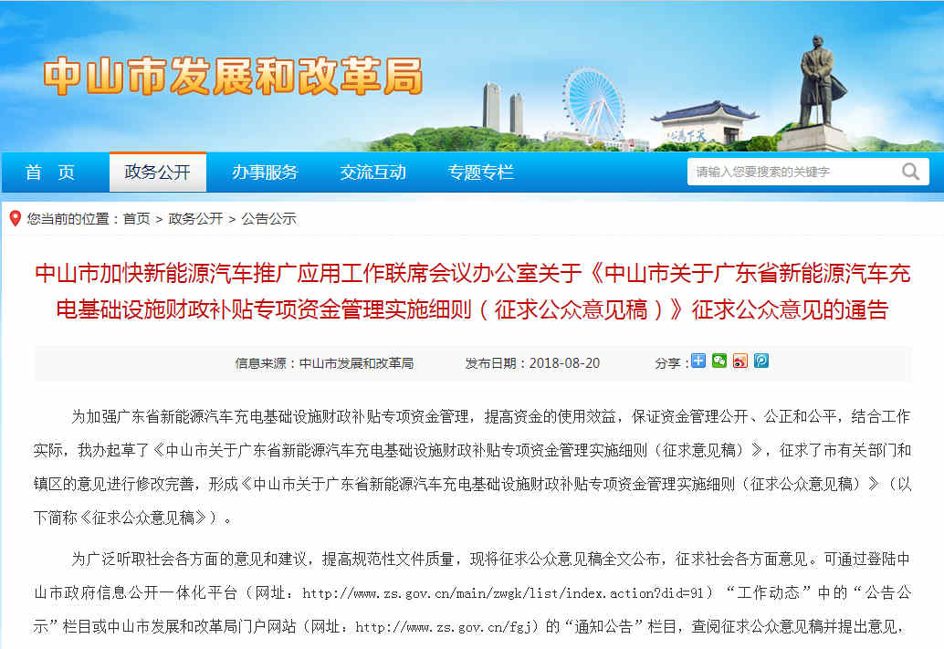 8月20日,广东中山市发布关于《中山市关于广东省新能源汽车充电基础设施财政补贴专项资金管理实施细则(征求公众意见稿)》(以下简称《意见稿》)征求公众意见的通告。
