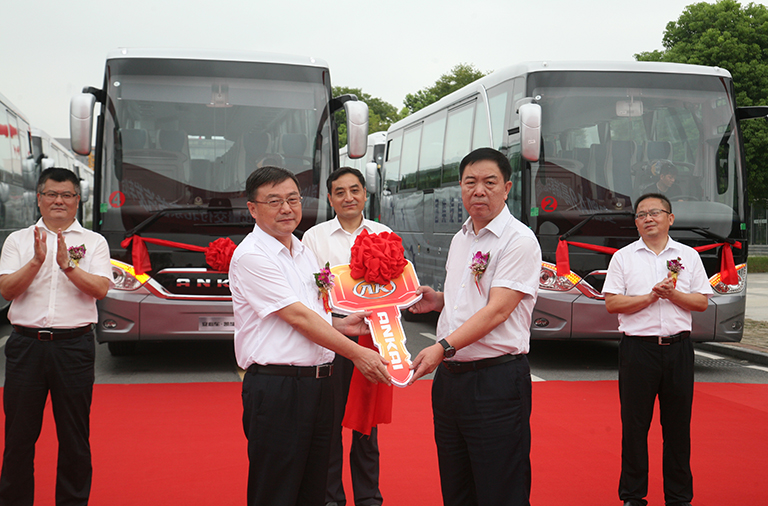 安凯客车总经理查保应向首汽集团旅游车分公司总经理李阳交付新车钥匙
