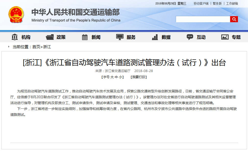 据了解,今年7月份,浙江省交通运输厅会同省公安厅、省经信委,研究制定了《浙江省自动驾驶汽车道路测试管理办法(试行)》,并于2018年7月27日至8月6日现公开征求意见。