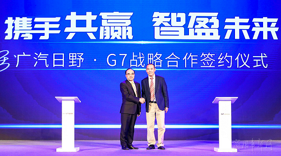 (左:广汽日野执行副总经理陈秀深,右:G7创始人兼CEO翟学魂)