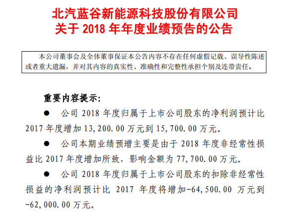 北汽蓝谷2018年净利预增1.32亿元至1.57亿元