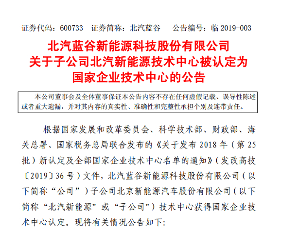 北汽蓝谷新能源科技股份有限公司旗下子公司北汽新能源技术中心被认定为国家企业技术中心。本次认定为国家企业技术中心后,北汽新能源将在技术中心创新能力建设、高技术产业化、战略性新兴产业发展等方面得到国家支持,并享受国家科技开发用品进口税收优惠等政策。 [详细]