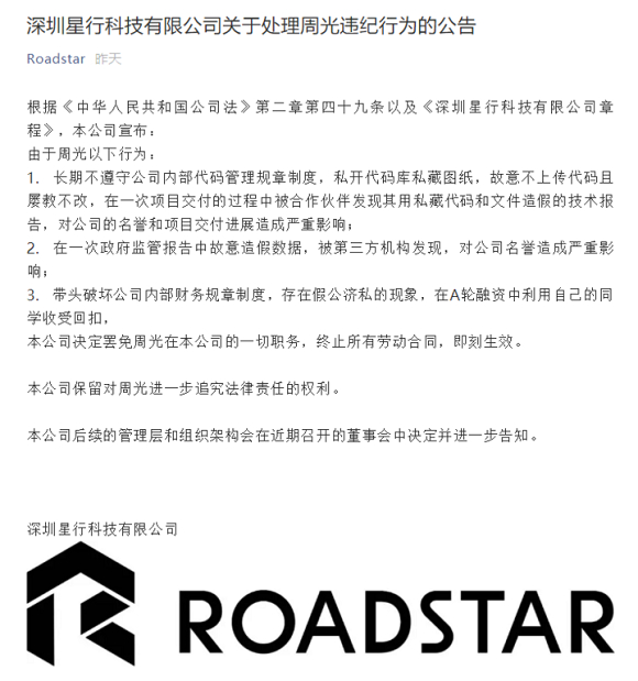 国内自动驾驶创业公司Roadstar.ai罢免创始人周光