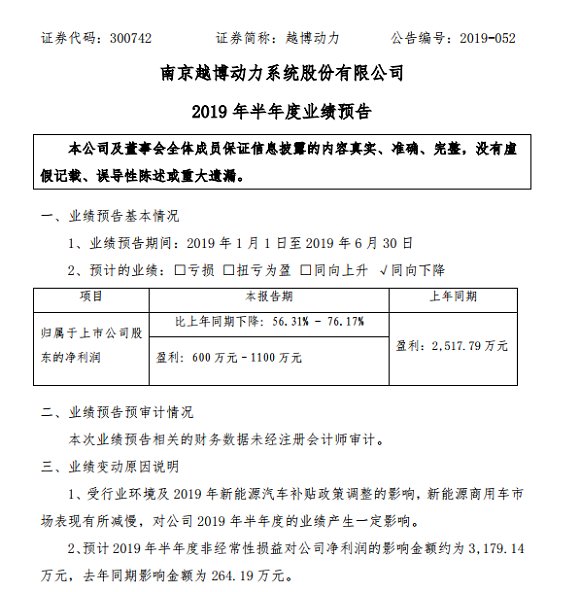 7月13日,越博动力发布2019年半年度业绩预告。预告显示,预计越博动力2019年上半年归属于上市公司股东的净利润为600万元–1100万元,同比下降56.31%-76.17%;预计2019年半年度非经常性损益对公司净利润的影响金额约为3179.14万元,去年同期影响金额为264.19万元。越博动力表示,受行业环境及2019年新能源汽车补贴政策调整的影响,新能源商用车市场表现有所减慢,对公司2019年半年度的业绩产生一定影响。 [详细]