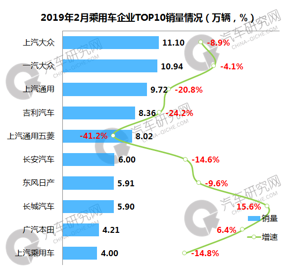 2月乘用车企业中,上汽大众位居第一,销量达到11.1万辆,同比下降8.9%,一汽大众紧随其后,销量10.94万辆,同比下滑4.1%;上汽通用销售9.72万辆,位居第三名,前十企业中仅长城和广汽本田实现增长,其他企业均呈下降趋势,其中上汽通用五菱降幅最大,超40%。 [详细]