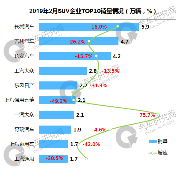 2月SUV前十企业中,长城汽车销量近6万辆,稳居榜首,增长16%;吉利汽车以4.7万辆成绩,稳居第二,长安汽车排名第三,销售4.2万辆,同比下降15.7%,一汽大众表现突出,单月增幅超75%。 [详细]