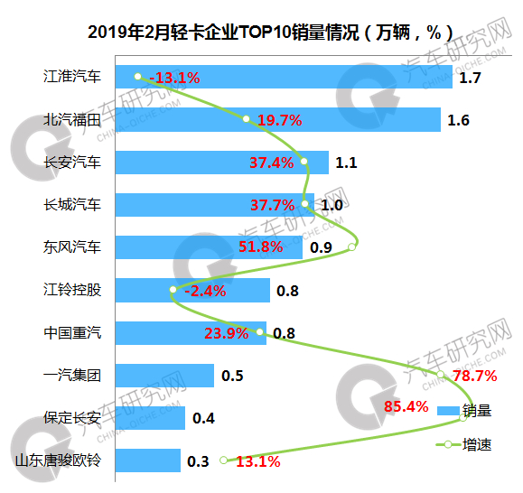 2月轻卡市场:总体稳步增长 前十企业八升二降
