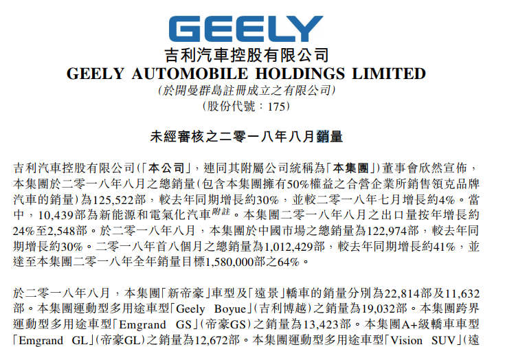 吉利汽车8月销量增长30% 全年目前完成64%