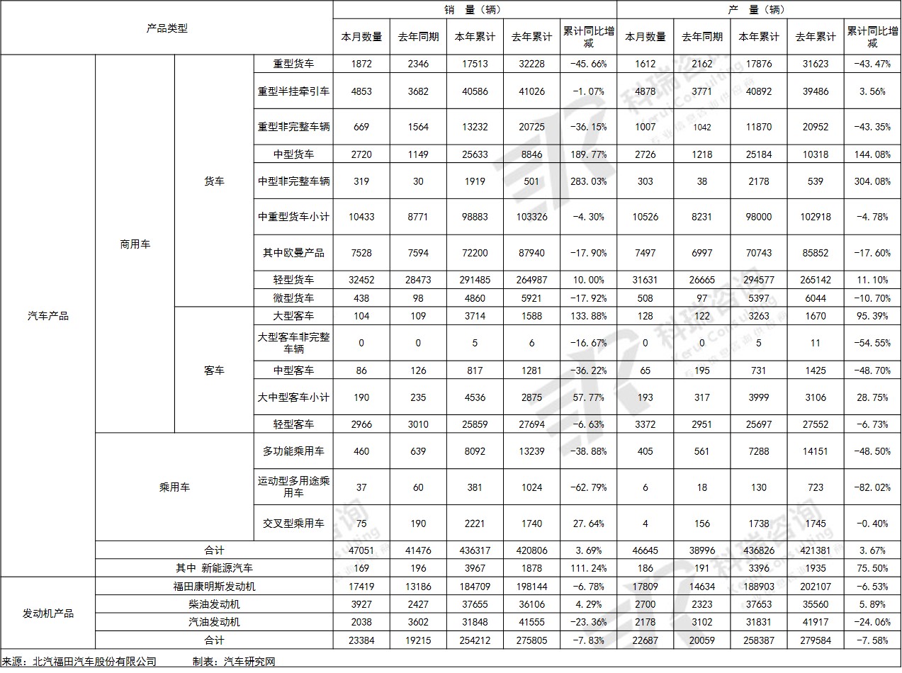 福田汽车2019年10月份销售各类商用车46479辆
