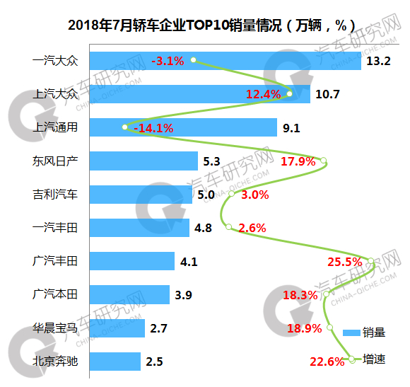 7月轿车企业中,一汽大众位居第一,销量达到13.2万辆,同比下滑3.1;上汽大众位居第二,共计销售10.7万辆,同比增长12.4。前十企业中,上汽通用下滑明显,同比下降14.1%,本月销量为9.1万辆;广汽丰田则增幅最大,同比增长25.5%。 [详细]