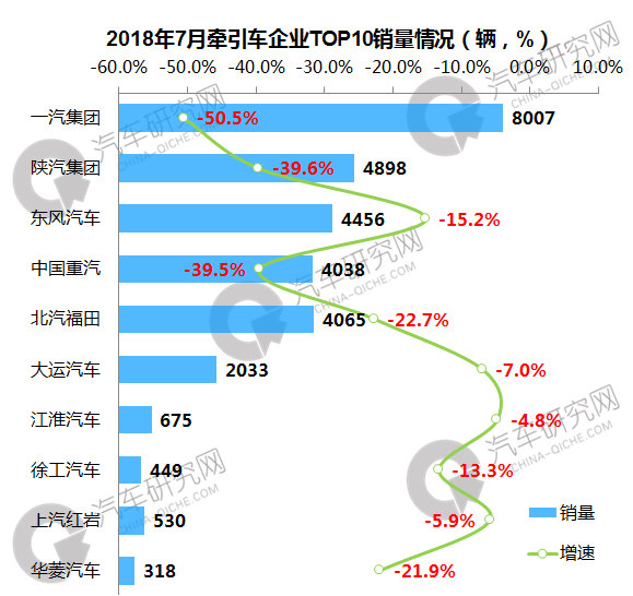 2018年7月牵引车企业:一汽集团下滑严重 超50%