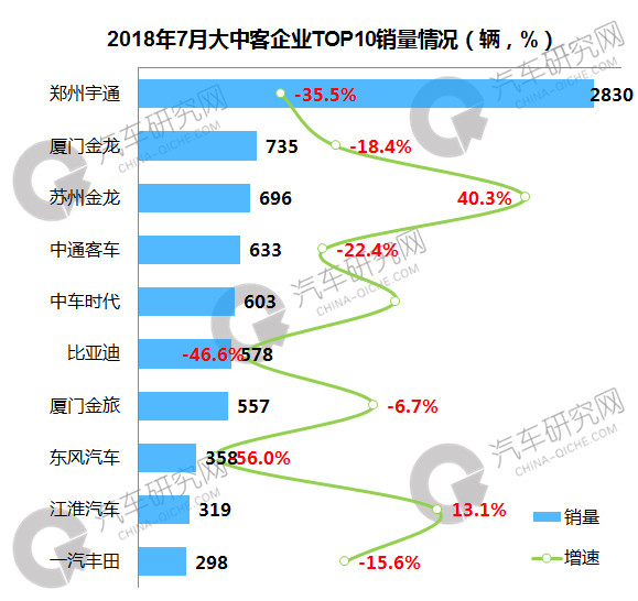2018年7月大中客企业:郑州宇通大中客销量遥遥领先