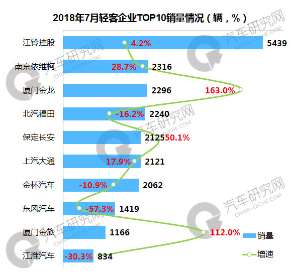 7月客车企业中,江铃控股位居第一,销量达到5439辆,同比增长4.2%;郑州宇通销量排名次席,同比则下降超过30%;前十企业中,厦门金龙和厦门金旅增幅相对较大,分别为70.9%和50.2%。 [详细]