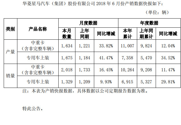 华菱星马汽车集团有限公司发布2018年6月产销快报 增长