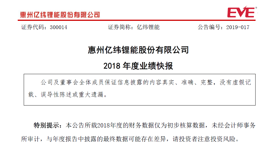 亿纬锂能2018年实现营业总收入435119.06万 同期上升45