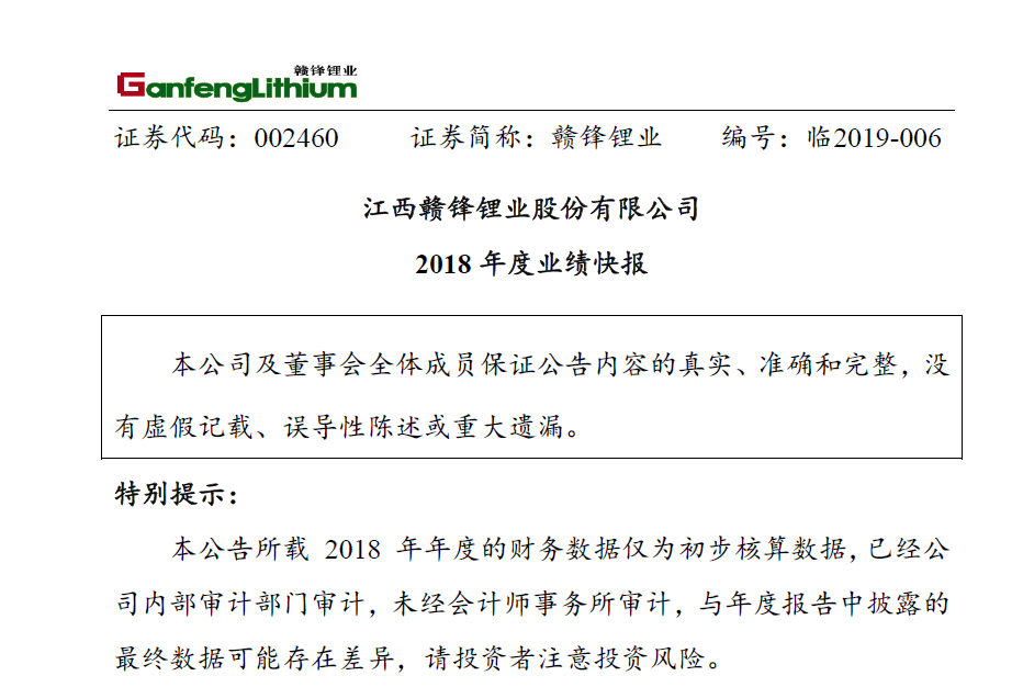 赣锋锂业:2018年净利润12.16亿元 同比降17.2%