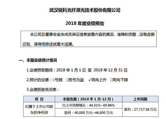 锐科激光发布业绩预告,公司预计2018年1-12月归属上市公司股东的净利润4亿元至4.6亿元,同比增长44.31%至65.96%。公司2018年高功率光纤激光器产品收入增长较快,成本控制较好,是公司业绩增长的主要原因。 [详细]