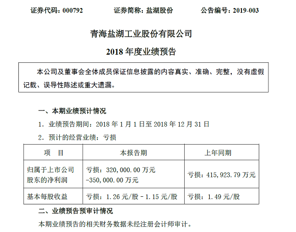 盐湖股份发布公告业绩预告称,公司预计2018年1-12月归属上市公司股东的净利润-35亿至-32亿。2017年公司巨亏41.59亿元。关于业绩亏损的原因,除了公司化工、钾、镁板块出现巨额亏损之外,盐湖股份还表示,子公司蓝科锂业生产碳酸锂1.1万吨,销售碳酸锂1.13万吨,碳酸锂价格较 [详细]