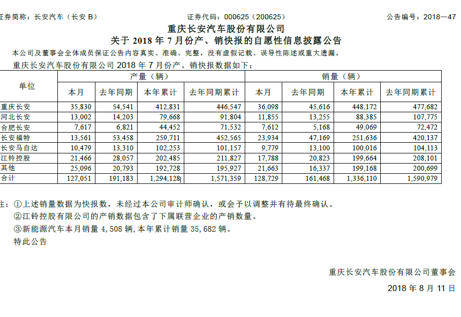8月11日,长安汽车发布2018年7月产销快报。数据显示,长安汽车1-7月汽车累计产量1294128辆,同比下降17.64%,累计销量1336110辆,同比下降16.02%。 [详细]