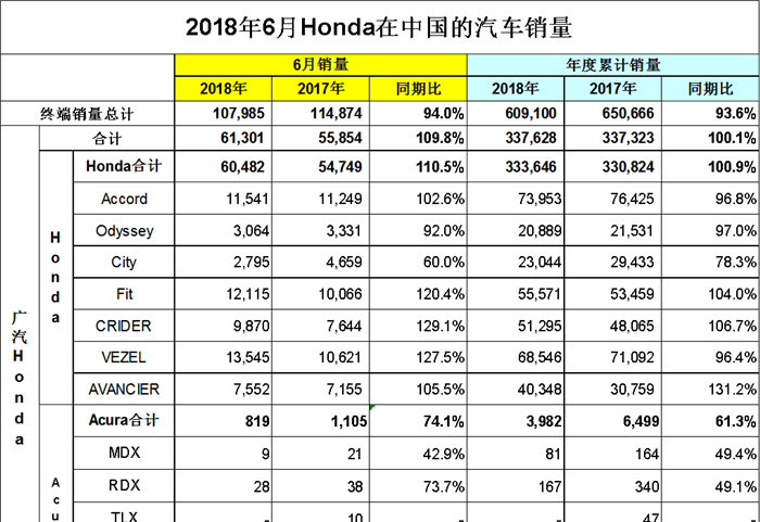 2018年7月3日,Honda发布2018年6月在中国的终端汽车销量。1-6月广汽本田汽车有限公司和东风本田汽车有限公司的终端销量总计609,100辆,同期比为93.6%。其中,广汽本田汽车有限公司2018年1-6月终端累计销量为337,628辆,同期比为100.1%;东风本田汽车有限公司2018年1-6月终端 [详细]