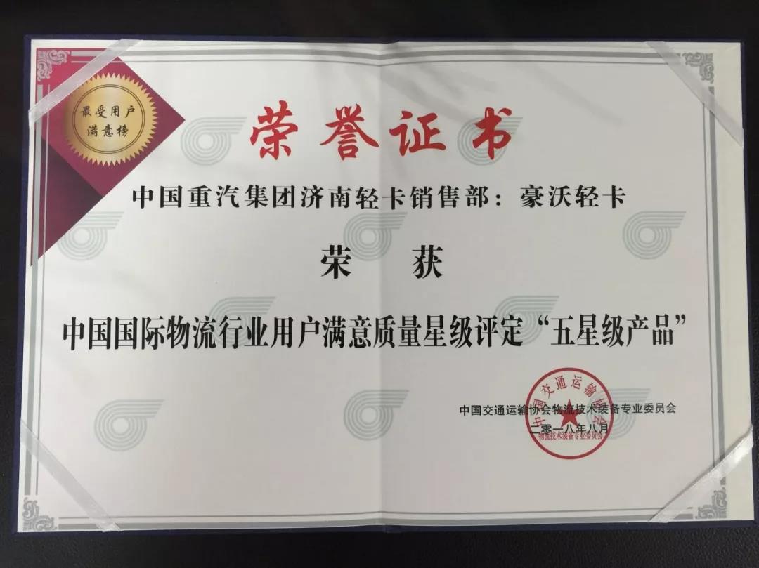 HOWO轻卡荣获“中国国际物流行业用户满意质量星级评定