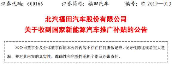 福田汽车收到国家新能源汽车推广补贴3.17亿元