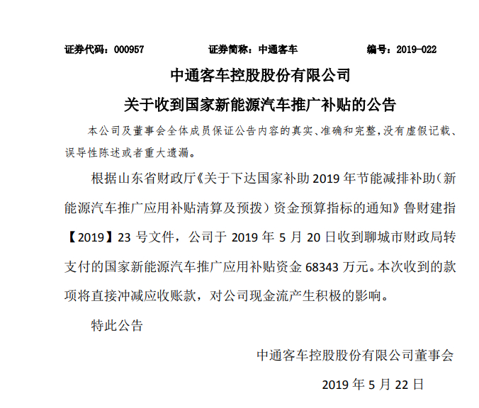 中通客车收到国家新能源汽车推广应用补贴资金68343万