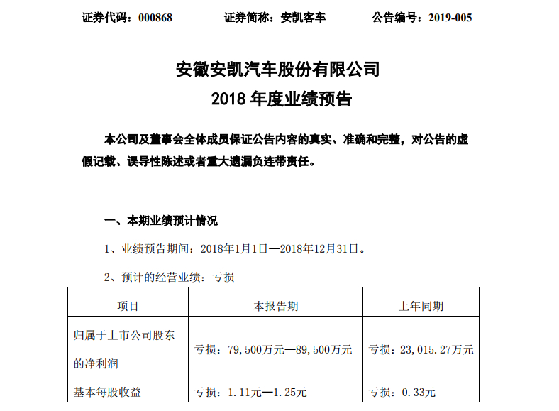 安凯客车2018年预计亏损7.95-8.95亿元 或面临退市风险