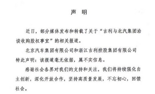 吉利、北汽发布联合声明 否认“洽谈收购股权事宜”