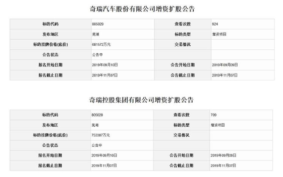 奇瑞控股和奇瑞股份拟同时通过增资扩股方式引入同一投资方,由同一投资方以现金出资认购奇瑞控股19.2亿元新增注册资本、认购奇瑞股份10.13亿股新增股份。根据长江产权交易所信息显示,奇瑞控股集团有限公司(以下简称“奇瑞控股”)和奇瑞汽车股份有限公司(以下简称“奇瑞股份”)增资扩股项目于今日正式挂牌,报名截止日期2019年11月07日。公告显示,奇瑞控股和奇瑞股份拟同时通过增资扩股方式引入同一投资方,由同一投资方以现金出资认购奇瑞控股19.2亿元新增注册资本、认购奇瑞股份10.13亿股新增股份。其中,奇瑞控股 [详细]