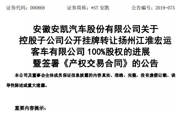 7月31日,安凯客车发布公告称,公司控股子公司江淮客车于2019年6月4日通过安徽省产权交易中心公开挂牌转让扬州宏运100%股权,转让底价2,838.52万元。 [详细]