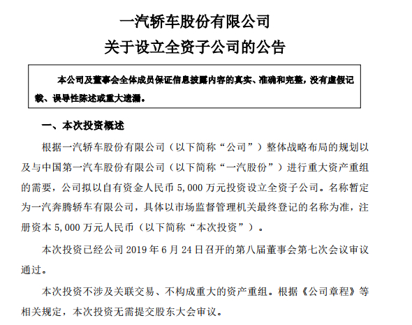 因重大资产重组需要一汽轿车出资5000万成立新公司