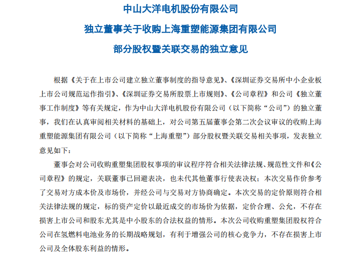大洋电机拟2.63亿收购重塑集团合计14.586%股权 布局氢燃料电池