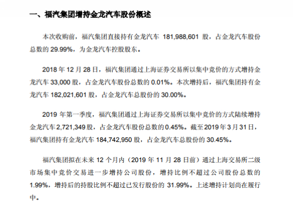 福汽集团继续增持金龙汽车 占金龙汽车总股份的30.45%