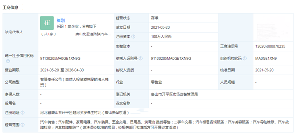 比亚迪成立新公司 注册资本100万人民币