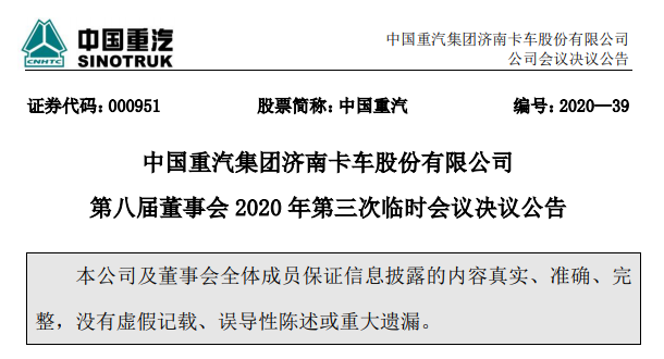 9月11日,中国重汽集团济南卡车股份有限公司发布第八届董事会2020年第三次临时会议决议公告,因工作调整原因,王德春不再担任公司第八届董事会董事、董事长以及董事会专门委员会等相关职务,宋进金不再担任公司第八届董事会董事及董事会专门委员会等相关职务。上述人员均未持有公司股份,并将不再在上市公司任职。 [详细]