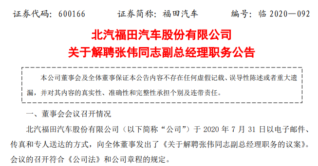 8月13日,福田汽车发布关于解聘张伟同志副总经理职务公告,公司董事会审议通过了《关于解聘张伟同志副总经理职务的议案》,解聘张伟同志的北汽福田汽车股份有限公司副总经理职务。 [详细]
