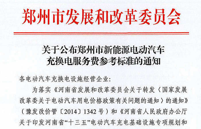 郑州:电动汽车充换电服务费按充电计量单位数收取
