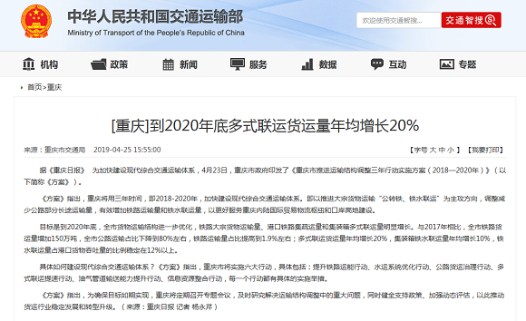 重庆到2020年底多式联运货运量年均增长20%