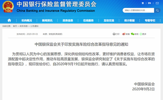 9月3日,中国银保监会印发《关于实施车险综合改革指导意见》(以下简称《意见》),将交强险总责任限额从12.2万元提高到20万元。其中死亡伤残赔偿限额从11万元提高到18万元,医疗费用赔偿限额从1万元提高到1.8万元,财产损失赔偿限额维持0.2万元不变。 [详细]