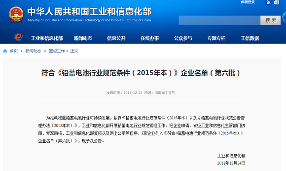 依据《铅蓄电池行业规范条件(2015年本)》及《铅蓄电池行业规范公告管理办法(2015年本)》,工业和信息化部开展铅蓄电池行业规范管理工作。经企业申请、省级工业和信息化主管部门初审、专家审核、工业和信息化部复核以及网上公示等程序,3家企业列入《符合<铅蓄电池行业规范条 [详细]